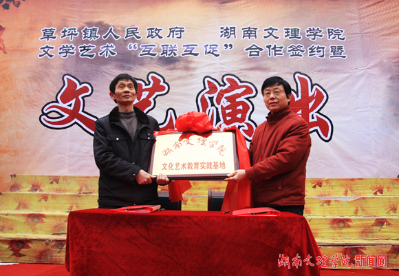 本网讯(记者 袁勇军 摄影 杨静)3月9日,湖南文理学院与常德市草坪镇政府文化艺术“互联互助”合作签约仪式在草坪镇举行。副校长龚作奇代表学校与该镇镇长宋才林签订协议,同时将“湖南文理学院文化艺术实习教育基地”的牌匾授予了草坪镇。省委宣传部副部长魏委等省市领导出席了仪式,并一同观看了由我校师生与草坪镇民间文化艺术团联合表演的文艺节目。